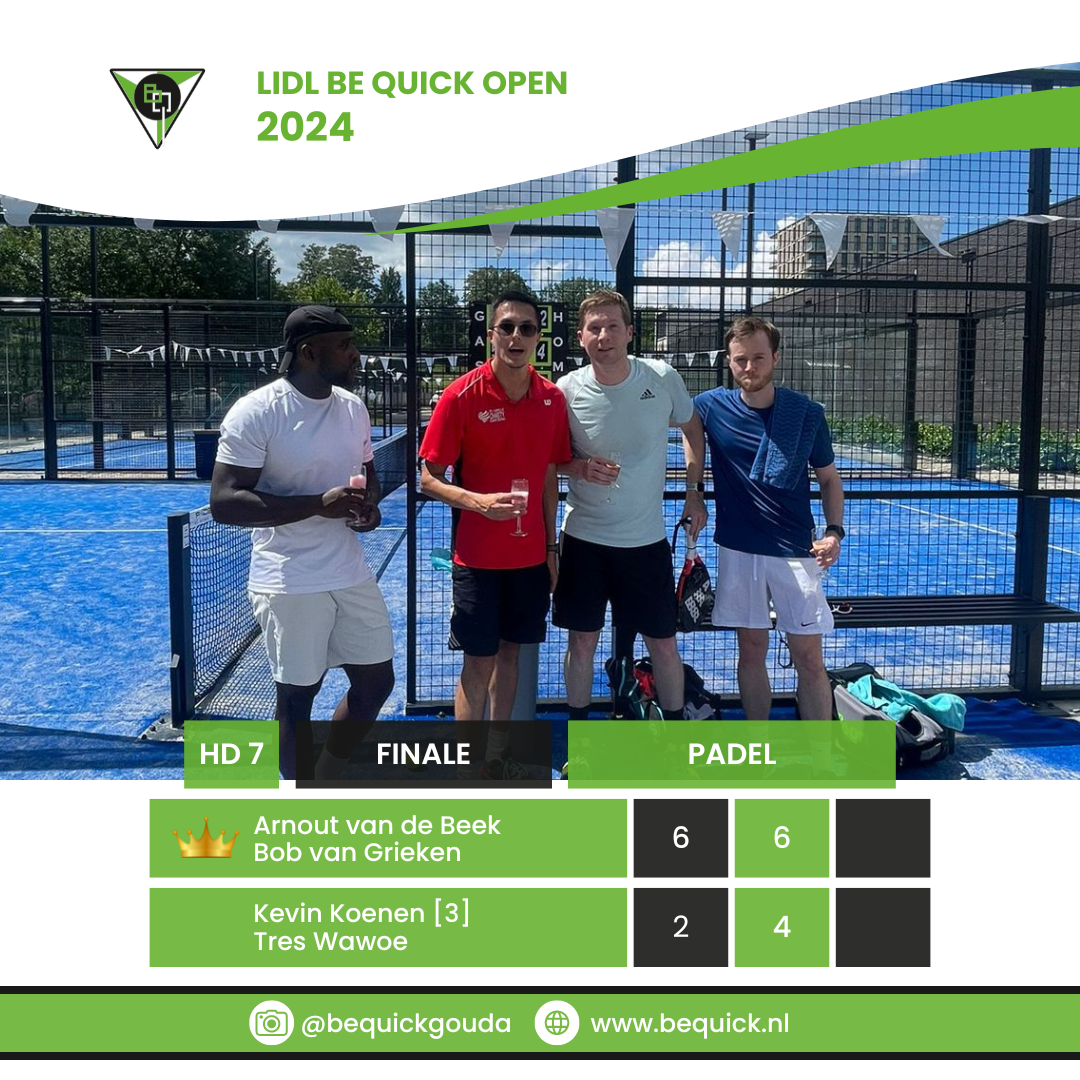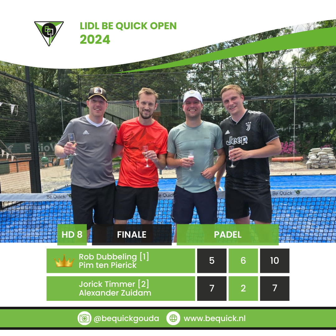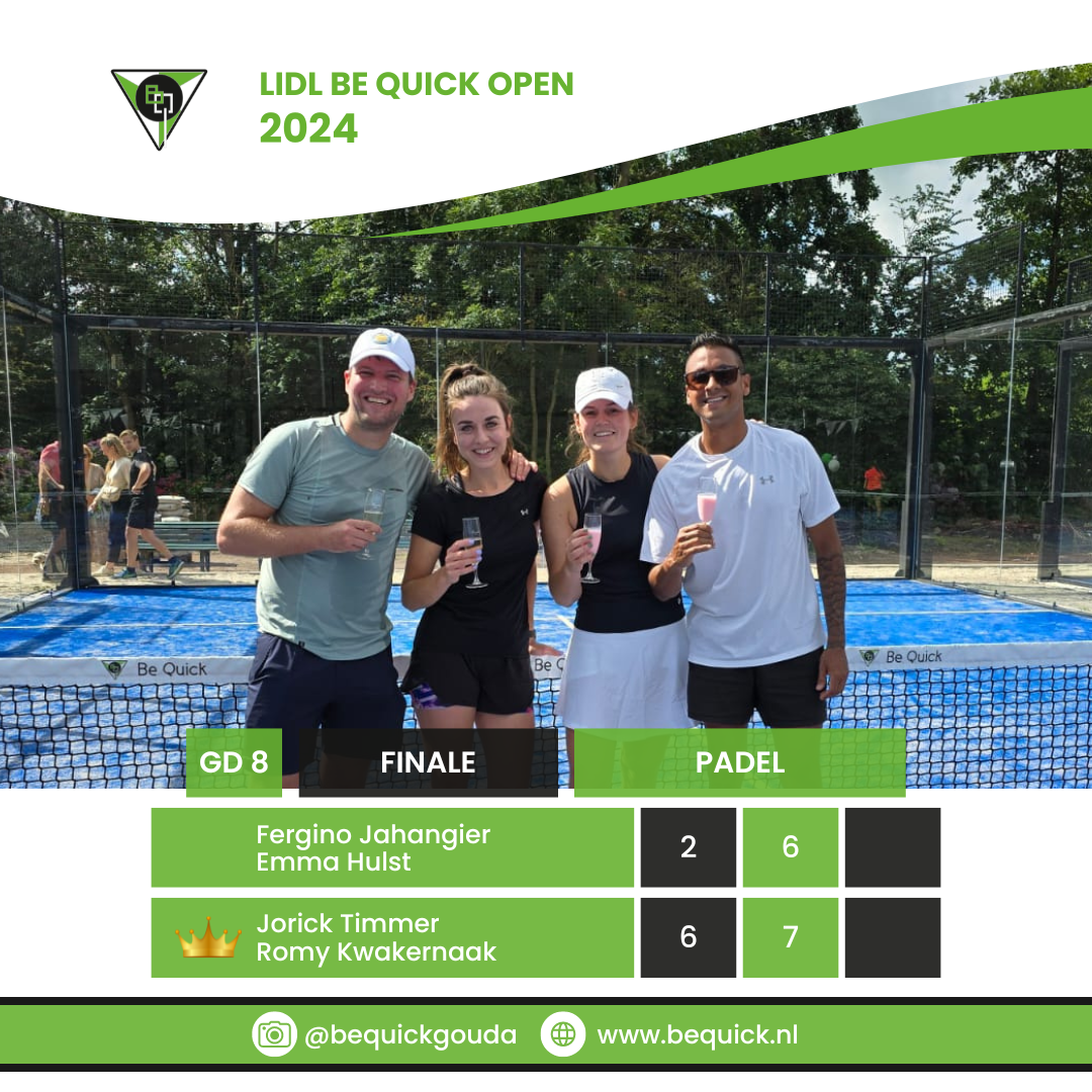 Het G.L.T.C. Be Quick LIDL Open Toernooi is op zondag 14 juli 2024 tot zijn eind gekomen. De winnaars zijn bekend. Volgens de eeuwenoude traditie betekent dat champagne voor de winna(a)r(e)s(sen) en fristi voor de verliezers. Bekijk hieronder wie welk onderdeel gewonnen heeft.