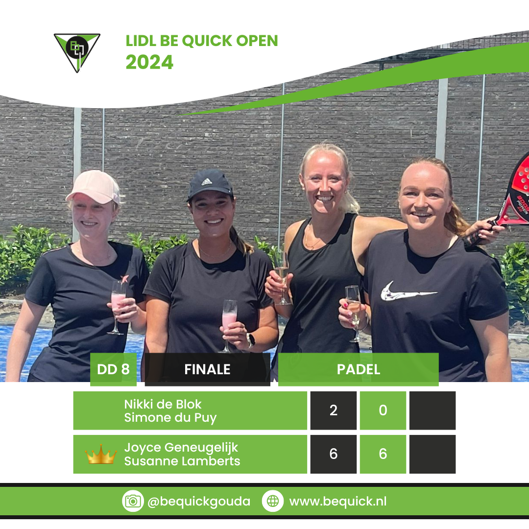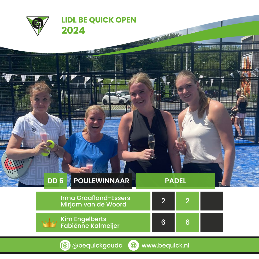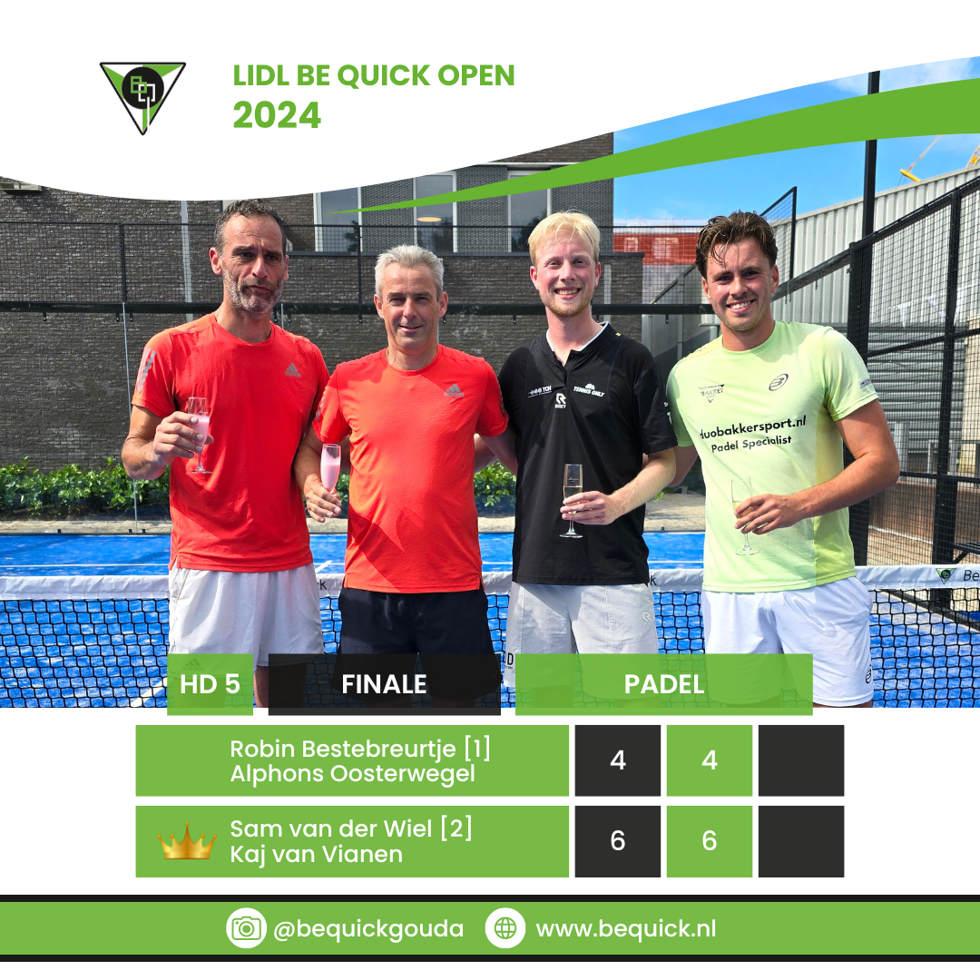 Het G.L.T.C. Be Quick LIDL Open Toernooi is op zondag 14 juli 2024 tot zijn eind gekomen. De winnaars zijn bekend. Volgens de eeuwenoude traditie betekent dat champagne voor de winna(a)r(e)s(sen) en fristi voor de verliezers. Bekijk hieronder wie welk onderdeel gewonnen heeft.